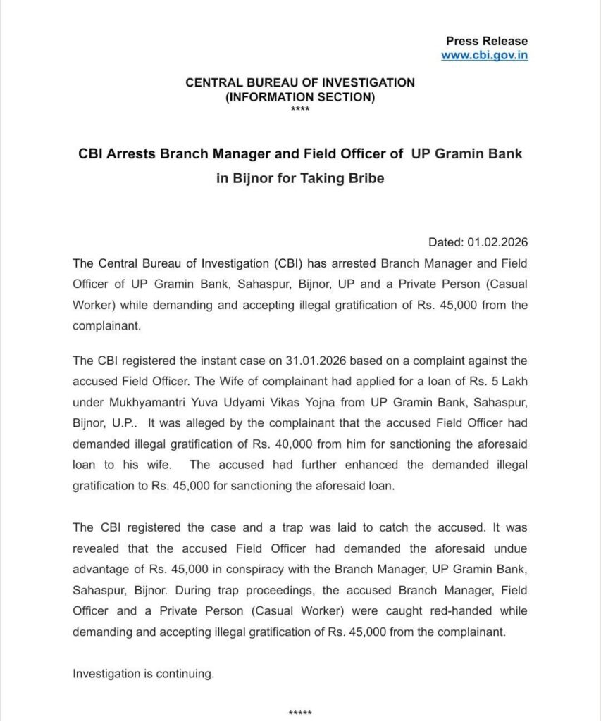 सीबीआई ने यह मामला 31 जनवरी 2026 को दर्ज किया था। शिकायतकर्ता की पत्नी ने यूपी ग्रामीण बैंक की सहसपुर शाखा में मुख्यमंत्री युवा उद्यमी विकास योजना के तहत 5 लाख रुपये के ऋण के लिए आवेदन किया था। आरोप है कि बैंक के फील्ड ऑफिसर विकास कुमार ने इस ऋण को स्वीकृत करने के बदले पहले 40,000 रुपये की रिश्वत मांगी थी, जिसे बाद में बढ़ाकर 45,000 रुपये कर दिया गया।
